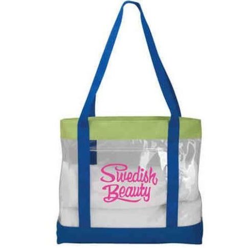 Made of clear PVC with 600D polyester bottom and handles this personalized tote bag has a clear fashion sense for your logo.