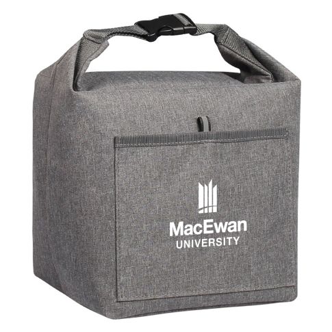 Portable insulated lunch bag with snap buckle handle and roll-top closure, designed to keep food and beverages warm or cold for extended periods. The buckle-closed handle makes it convenient to tie to your backpack or alongside a briefcase.