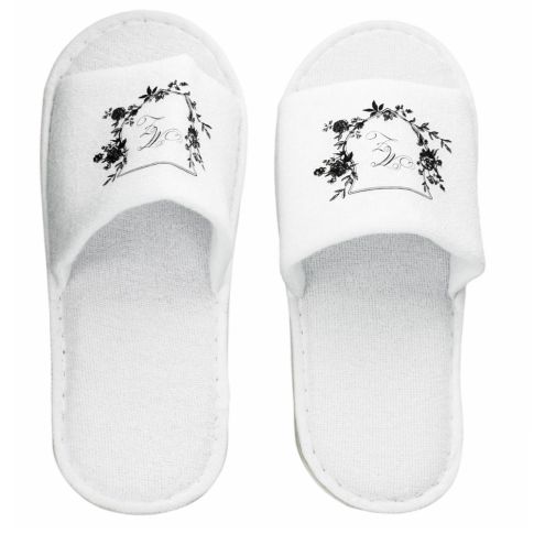 This is an open-toe terry cotton hotel slipper which comes in the standard color white. It doesn't matter if your feet are a little smaller than average.