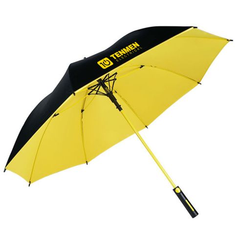 Always stay dry with the two-tone custom automatic open umbrella. This sturdy umbrella with a contrasting underside features a colored shaft and handle.