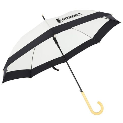Easily carry this non-folding, two-tone accented custom umbrella to any destination with the handy hook wooden handle.