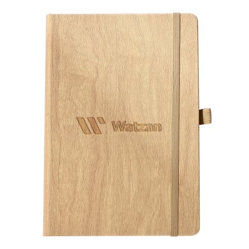 The hardcover of this wood grain custom notebook features a unique wood pattern and a closure band in a coordinating colour.