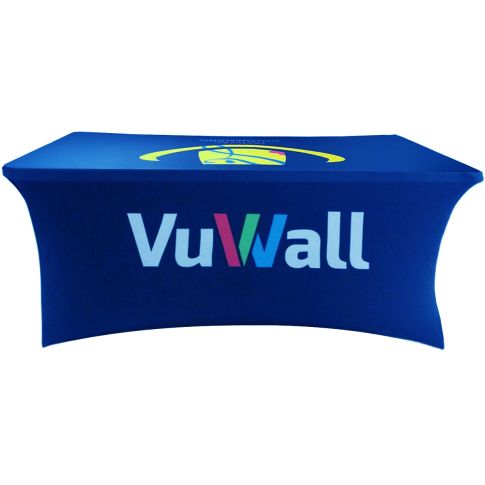 Flexible and form fitting custom table cloth is made with poly-stretch fabric that eliminates wrinkles and fits snugly over most standard 6 ft. tables.