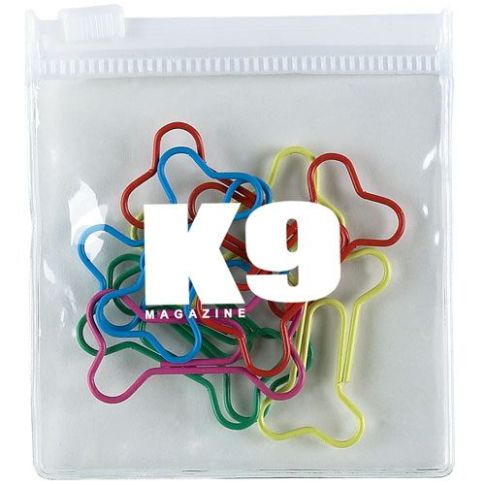 10 pcs multi-colored bone shaped paper clips packed in clear vinyl logo zip pouch. A great way to spice up the work place with function. Choose your zip pouch color to match your corporate colors.