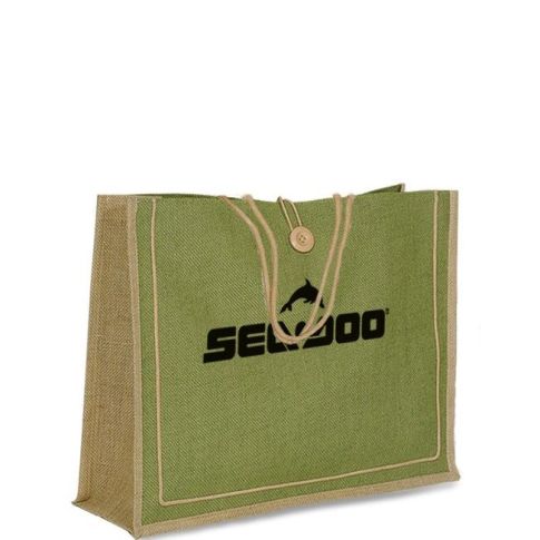Promotional tote made from 70% jute - a natural vegetable fiber, and 30% waterproof coating.