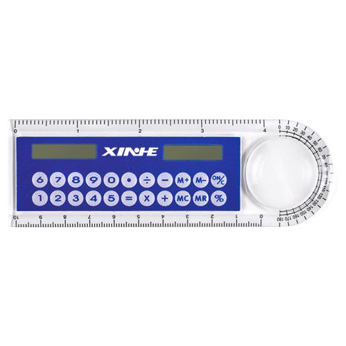 This promotional ruler features a calculator, protractor and magnifying glass all in one.
