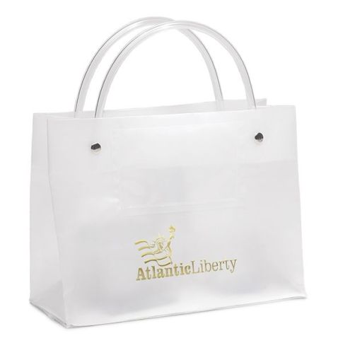 Add to Wish ListMake an impression with this executive-style Promotional Frosted Clear Tube Handle Bag with Pocket. Featuring a 3.25" x 2.25" interior clear pocket to hold your business card(s) and riveted plastic tube handles to ensure durability.