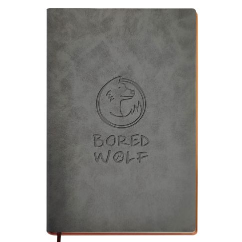 A soft cover promotional notebook journal with a traditional look and innovative features that includes: